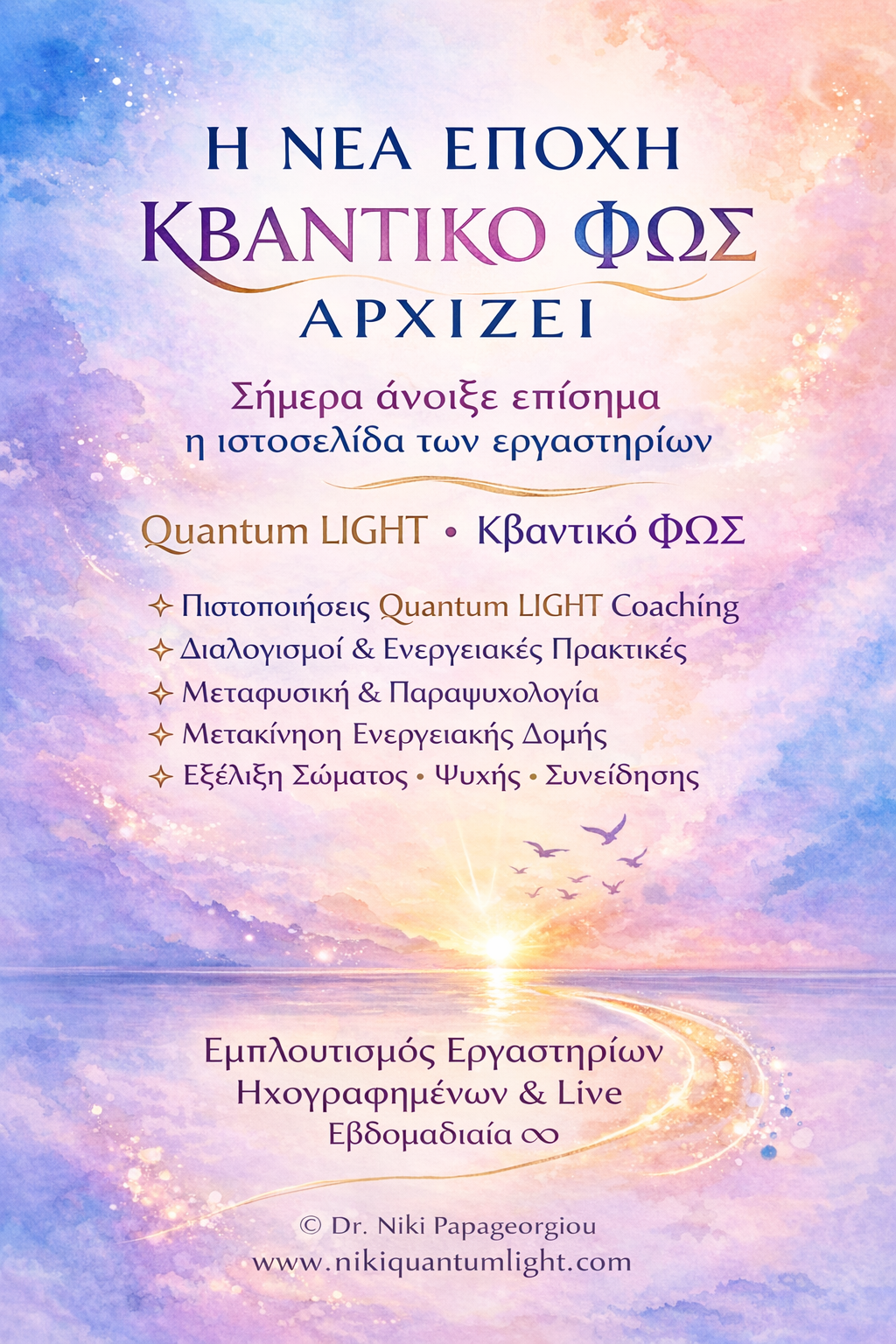 Πηγή: Σύντομα αναβάθμιση του πυρήνα του www.nikiquantumlight.com Η επίσημη παγκόσμια ιστοσελίδα του Quantum LIGHT Coaching θα ανανεωθεί αυτή την άνοιξη με την πλήρη σειρά των 55+ μαθημάτων coaching και τα αυθεντικά βιβλία συγγραφής Dr. Niki Papageorgiou Author Founder Publisher of Quantum LIGHT Schools